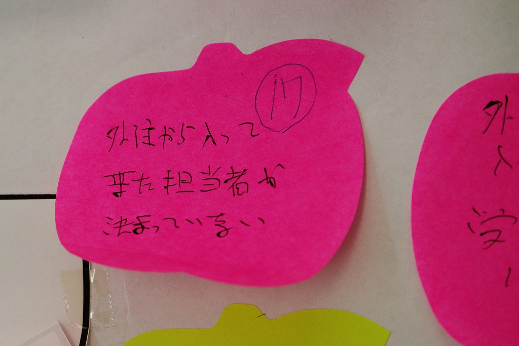 次に、問題点として指摘された事柄が書いてある付箋を見ながら、皆で解決策を考える。解決策の内容は、①自分で処理できるもの、②ルールの見直しが必要なもの、③ケイズに対応を依頼するものの概ね3パターンに分けている。