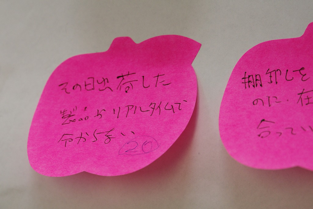 模造紙には業務フローと合わせて、あらかじめTPiCSでできているところと、できていないところを書いておく。次に、各人が色分けされた付箋を使って現状の問題点や改善すべき事柄をその人なりに洗いざらい書き、その付箋を模造紙に貼っていく。たとえば「私は発注担当だが、急な注文が多くて困る」といった具合だ。