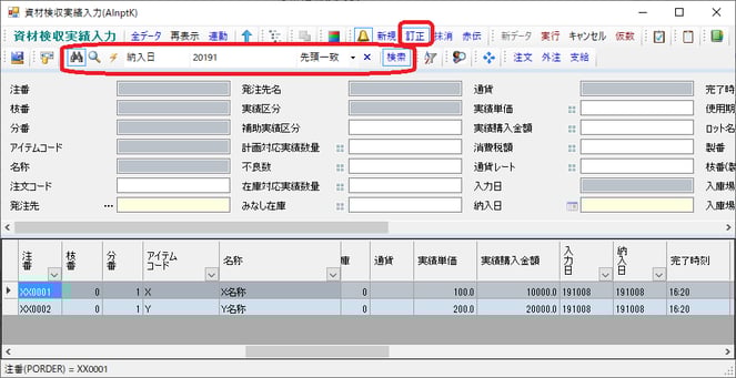 ②[業務ニュー]-[資材業務]-[資材検収実績入力]で、[訂正]ボタンを押すと実績データの表示モードになります。