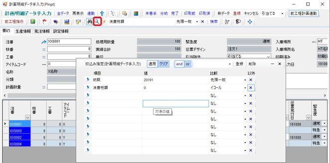 虫眼鏡のアイコンから納期で絞込みする場合は、文字フィールドなので”191001”以降では絞込みが出来ないめ、”20191”先頭一致(2019年10月のデータ)で絞込みます。
