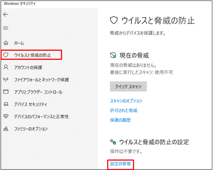 [設定]-[更新とセキュリティ]-[Windowsセキュリティ]-[ウィルスと脅威の防止]