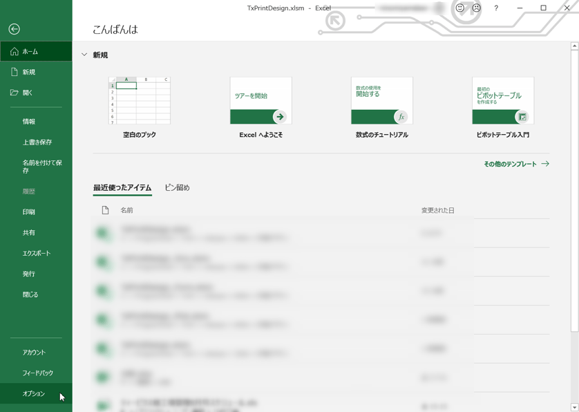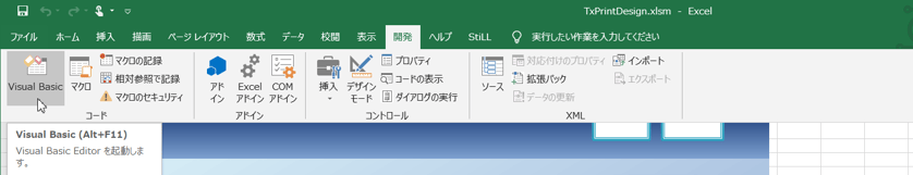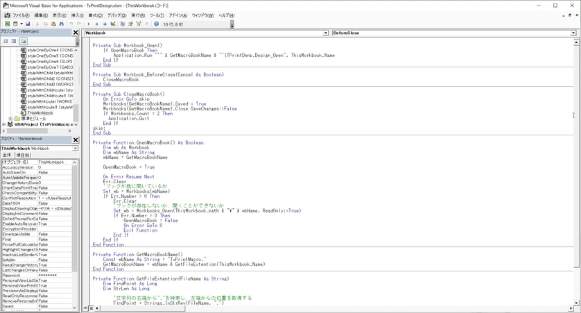 Excelのオプション設定で[開発]のリボンを表示して[開発]-[Visual Basic]を開き、[VBAProject(TxPrintDesign.xlsm)]-[Microsoft Excel Objects]-[ThisWorkbook]をダブルクリックして、上記の「復旧用のVBAコード」コピーし、保存します。