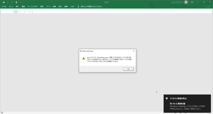 WindowsのアンチウィルスDefenderの2020/5/20のセキュリティインテリジェンス(パターンファイル1.315.1016.0)の更新によって、Excelデザインファイルが起動したタイミングで以下のメッセージが表示され、マクロが削除される事象を確認しました。