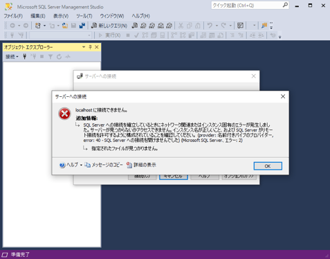 サーバー名:localhost で接続できるのは、インストール時に、既定のインスタンス を選択により、インスタンス名が MSSQLSERVERになっているときのみです。