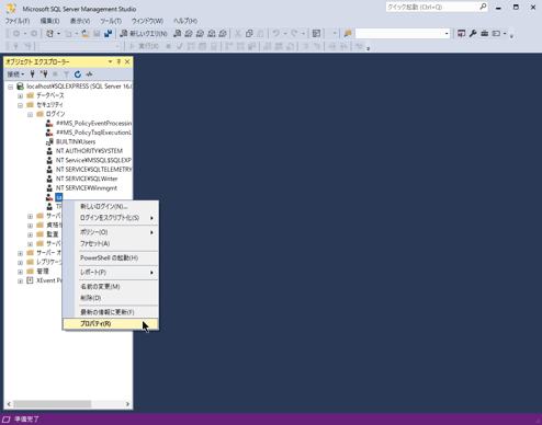 [セキュリティ]-[ログイン]-「sa」を選択し、右クリックメニューの[プロパティ]をクリック。