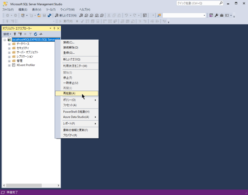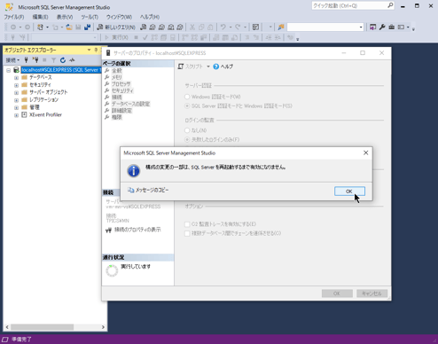 再起動ができたら、再度、サーバーのプロパティより混合認証に切り替わったか確認するとよいです。