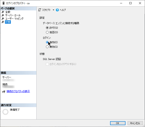 ・saのユーザーのログインが有効になっていない。