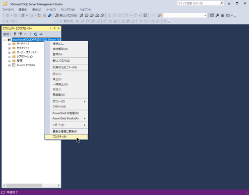サーバー(インスタンス)を選択して、右クリック-プロパティをクリック。
