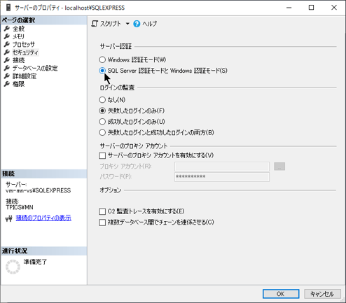 サーバーのプロパティの[セキュリティ]で混合認証モードへ切り替え