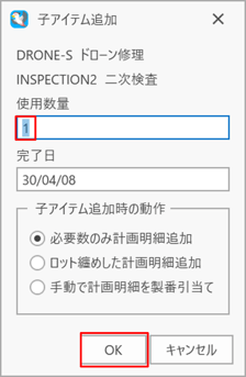 [子アイテム追加]パネルが表示されるので使用数量を入力します。