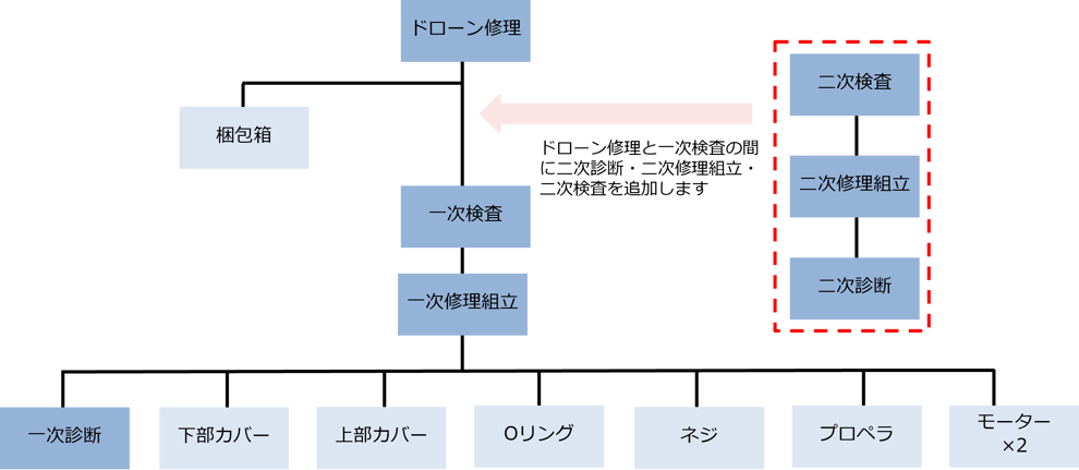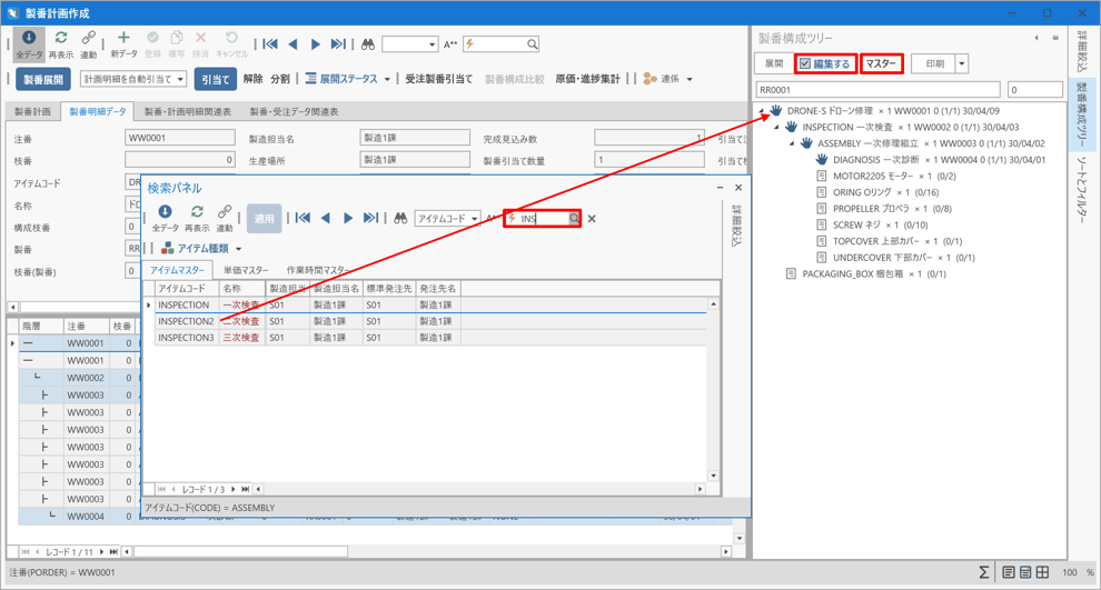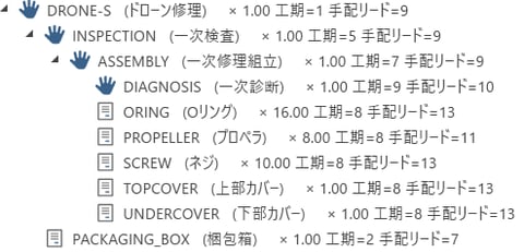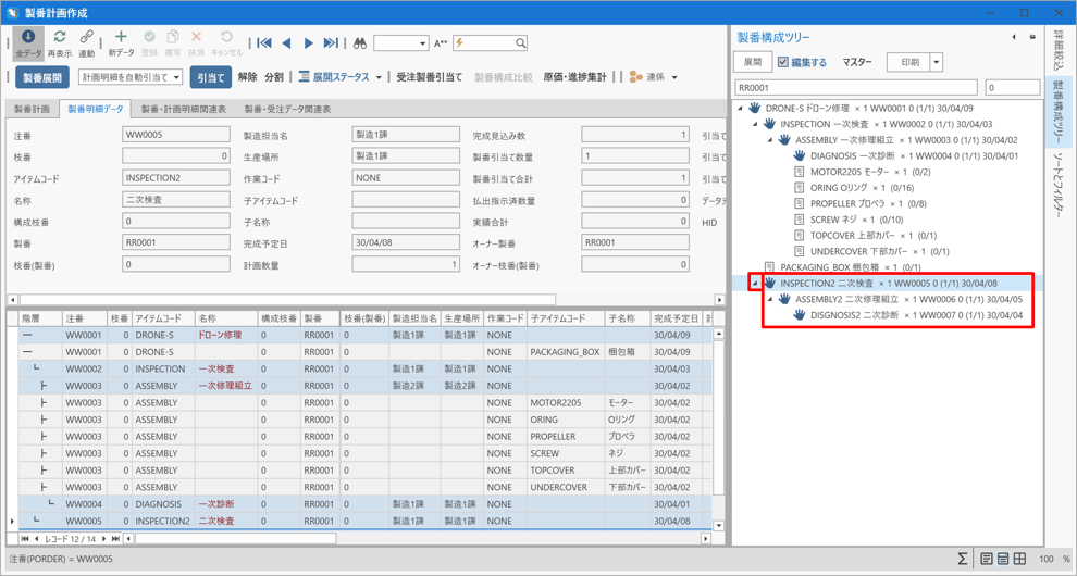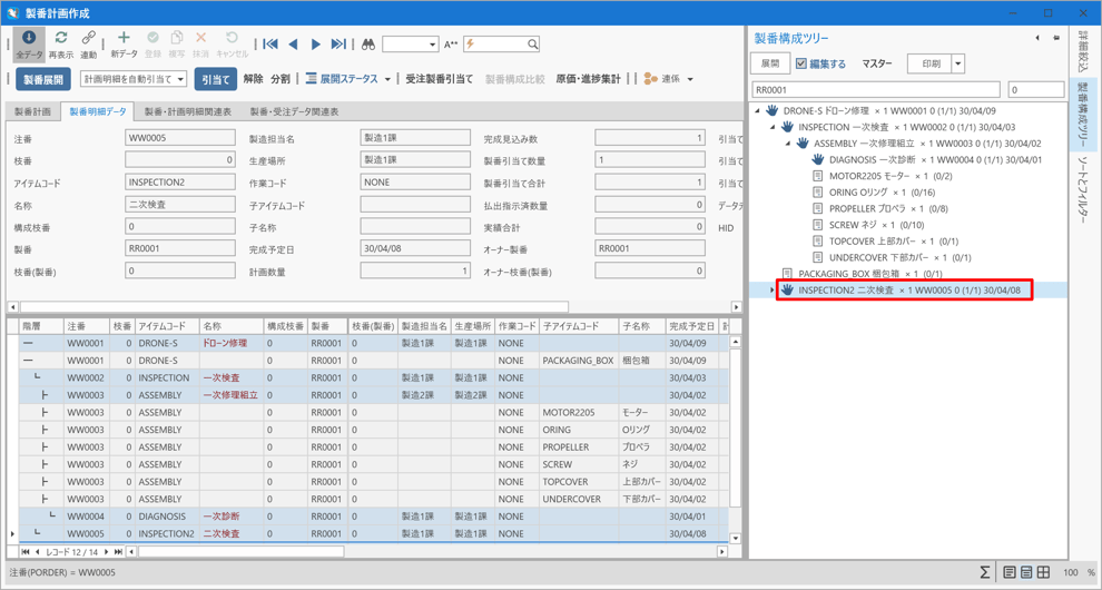 [製番構成ツリー]パネル上の「DRONE-S ドローン修理」の子アイテムとして「INSPECTION2 二次検査」が追加されているのを確認します。