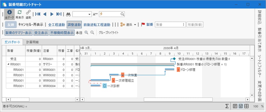 製番明細ガントチャートを開き、全体のスケジュールを把握します。