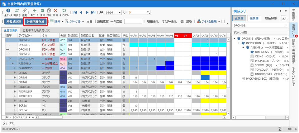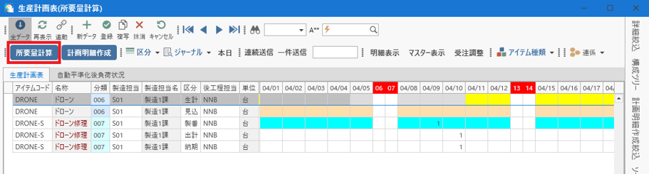 [生産計画表(所要量計算)]フォームを開きます。