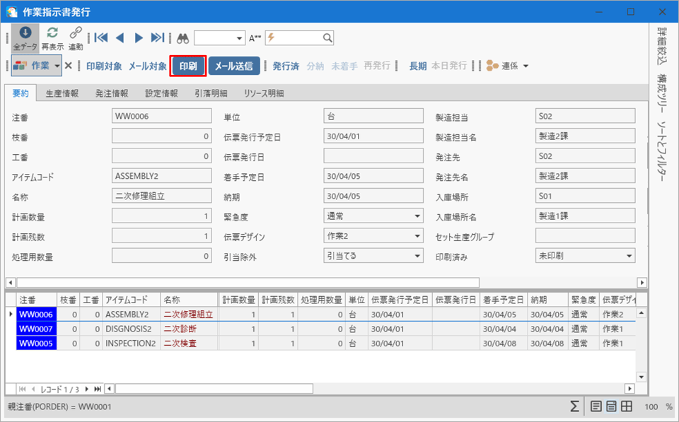 [作業指図書発行]フォームを開きます。