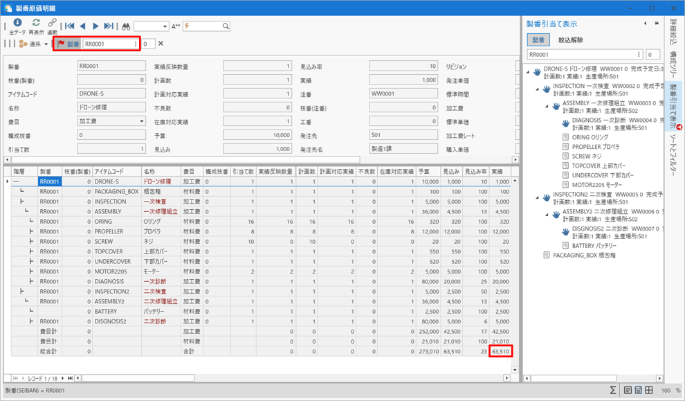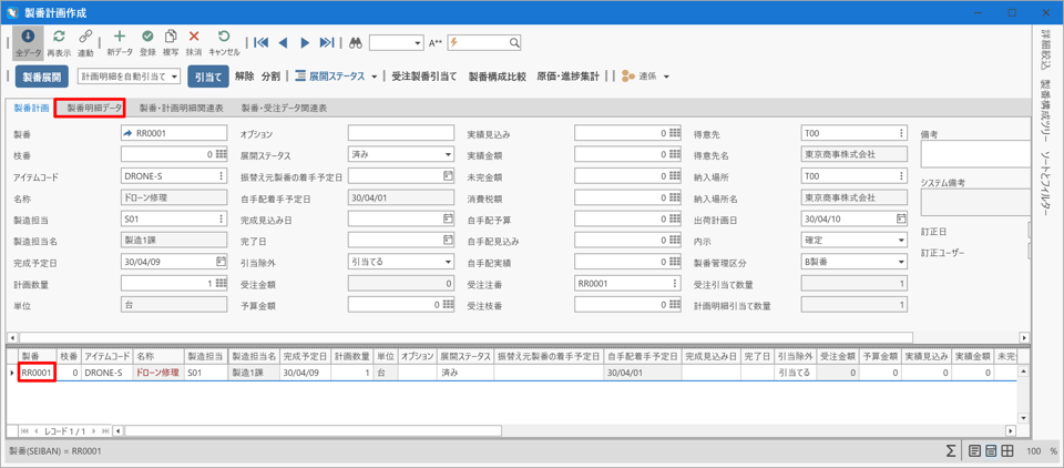- 製番 RR0001を選択し[製番明細データ] タブシートを選択します。