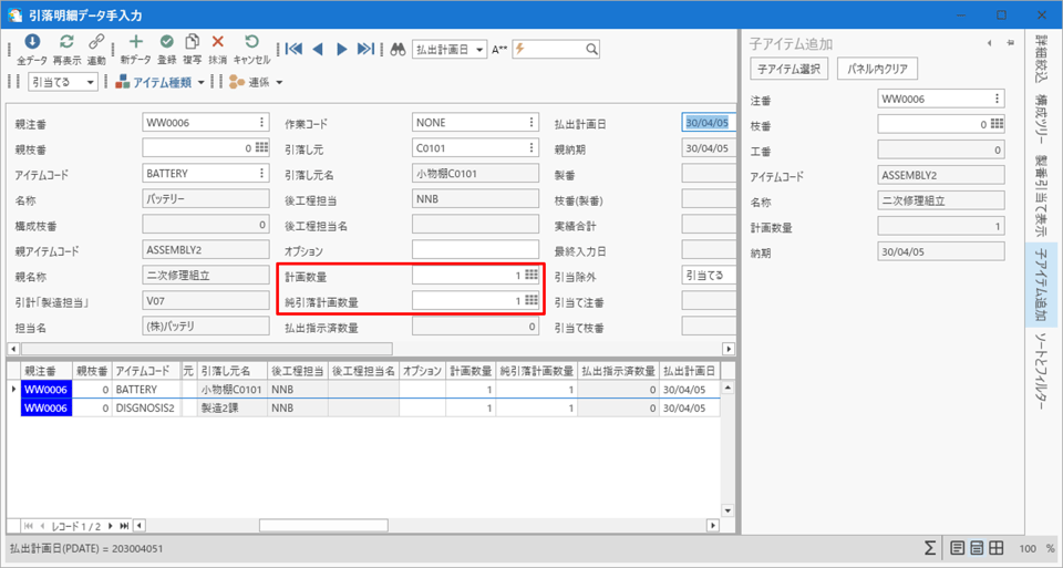 [計画業務] - [引落明細データ手入力]を開き、子アイテムを追加します。