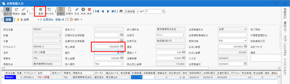 これで、売上単価が反映された出荷実績が登録されます。