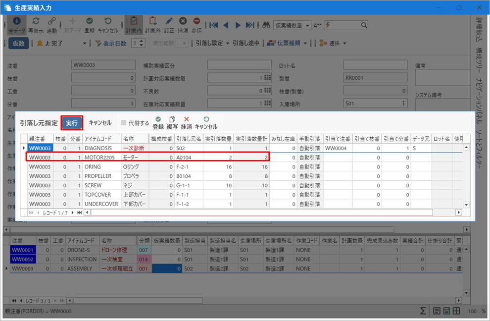 一次修理組立に一次診断で追加したアイテム「MOTOR2205」が2個引落されるか確認しながら実績を入力します。