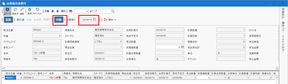 - グリッドに出荷したいデータが表示されていることを確認します。