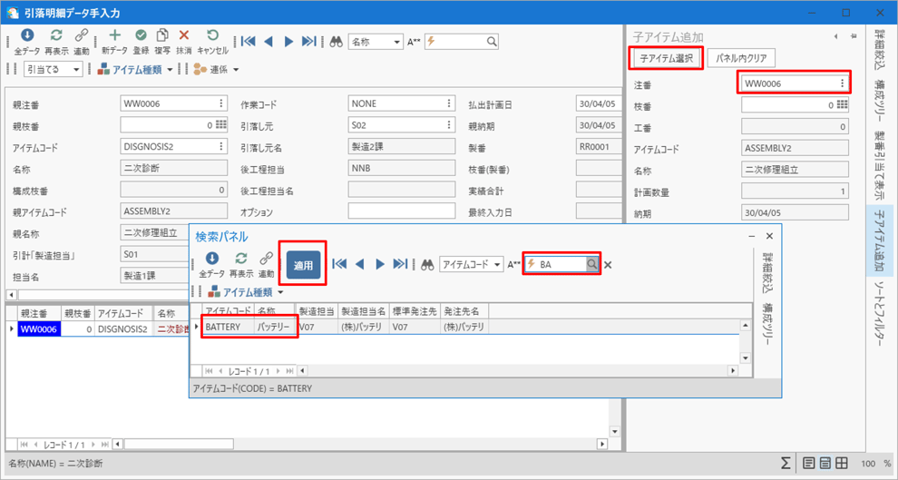 「ASSEMBLY2 二次修理組立」と「DISGNOSIS2 二次診断」が子アイテムとして表示されます。