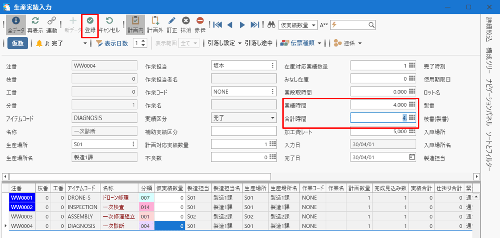 (6) 一次診断が終わり生産実績入力を行う