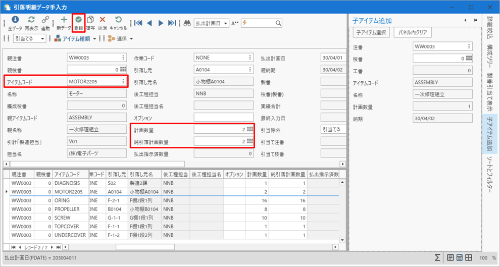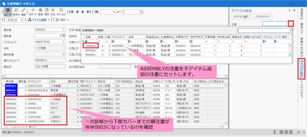 一次診断・Oリング・プロペラなどと同様に、親注番WW0003の子アイテムとして追加します。