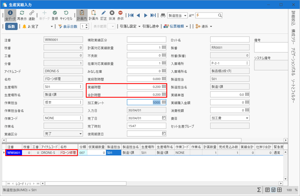 [生産実績入力]フォームを開きます。