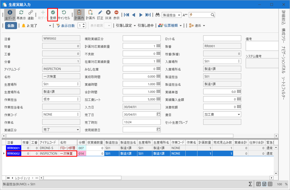 (10) 一次検査が終わり生産実績入力を行う