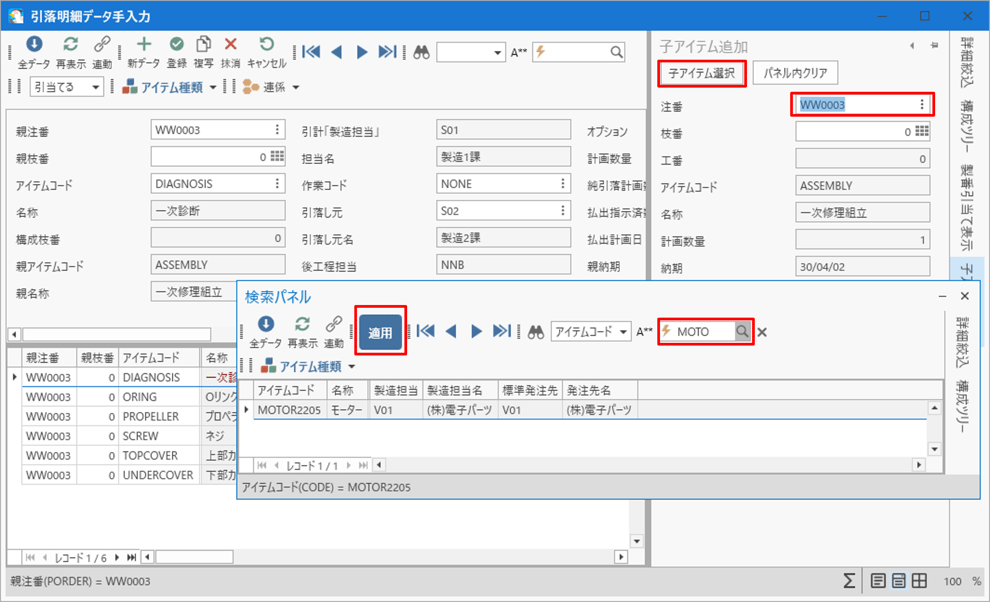 一次診断の結果、モーター2個を交換することになり、一次修理組立の子アイテムとして引落明細に追加します。