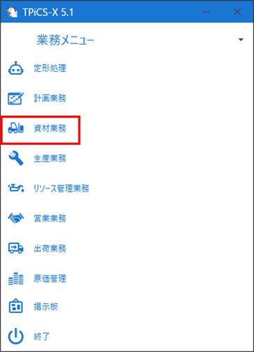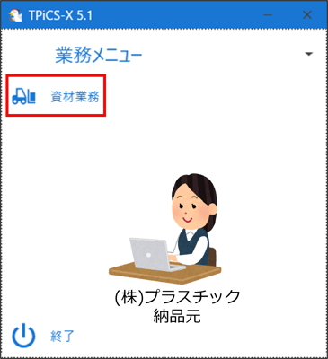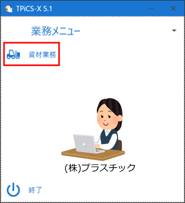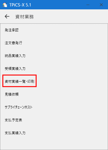 [資材業務]-[資材実績一覧・印刷]ボタンを押します。