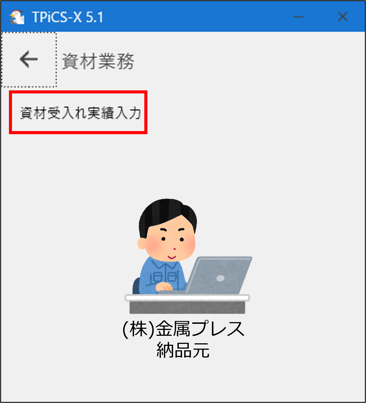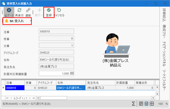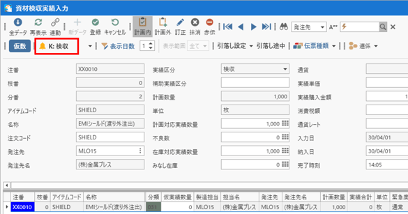 (株)金属プレスから納品された材料の受領処理を行います