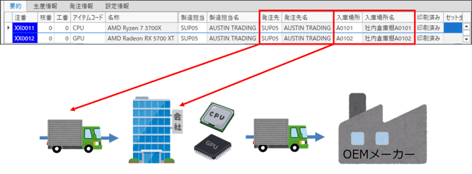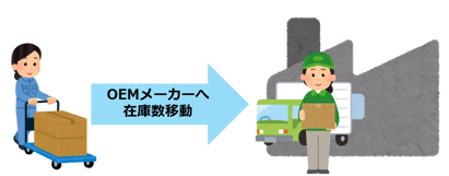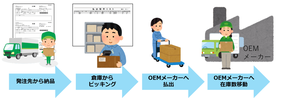 OEMメーカーでは調達できない部品を、自社倉庫を経由してOEMメーカーへ支給する流れを設定します。