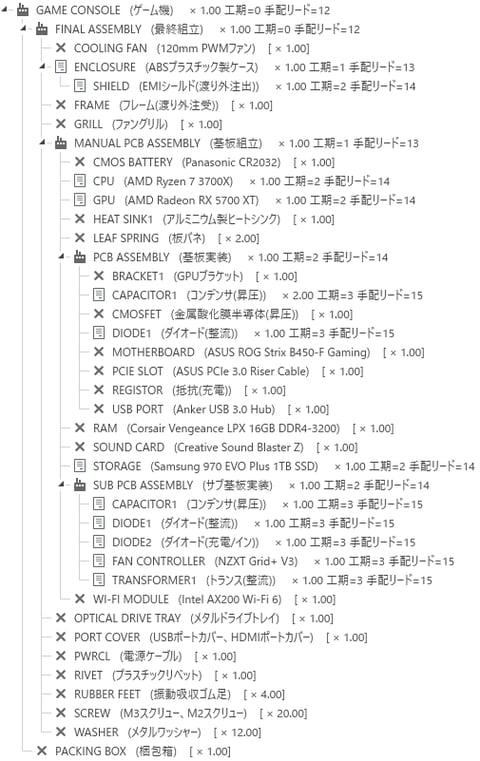 親アイテムコード「PCB ASSEMBLY」で構成ツリー展開をします。