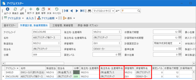 [所要量計算、製番展開関係]タブに切り替え、保管場所には自社倉庫などを設定します。
