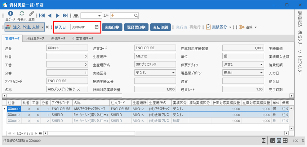 渡り外注に実績を入力してもらうことで、日々の実績管理として、購入品や外注加工品の実績データを一覧表示で確認したり、入庫日報を印刷しながら管理を行っていきます。