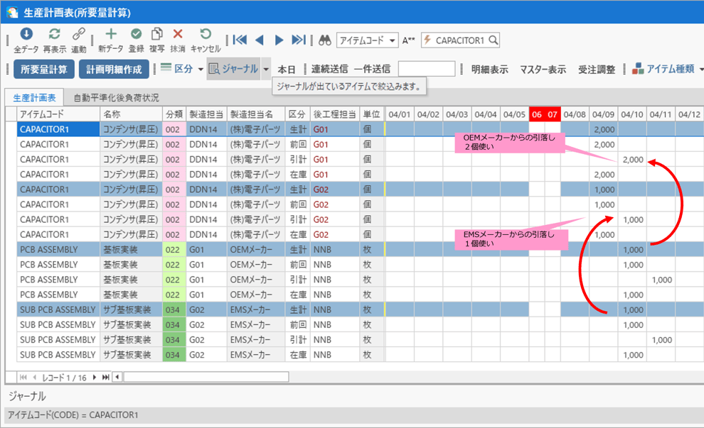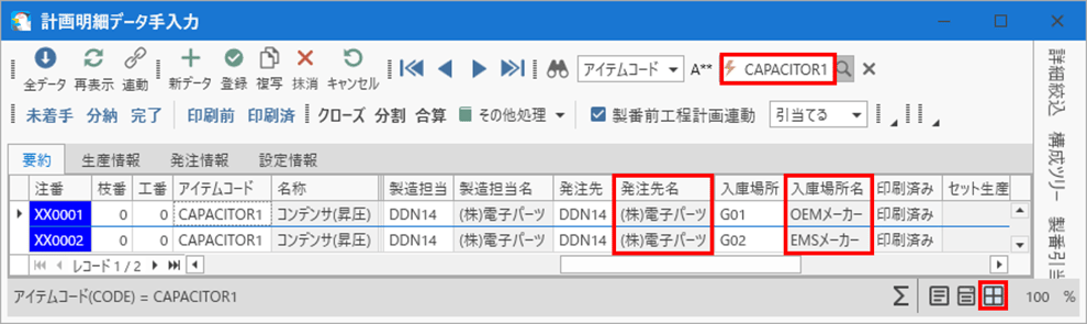 コンデンサはOEMメーカー(G01)から2,000個の引計が作成されていることが確認できます。