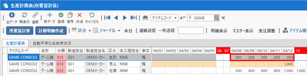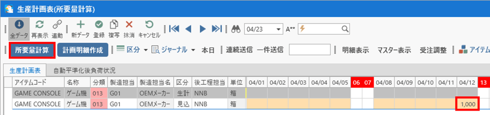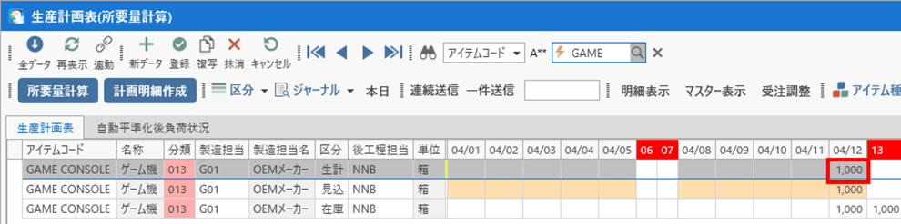 ゲーム機の計画を複数に分割すると、計算結果が複数件作成され、データの確認が煩雑になるため、今回は1,000の計画数量で所要量計算を行います。