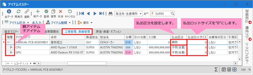 親アイテムコード「MANUAL PCB ASSEMBLY」と、子アイテムコード「CPU」「GPU」を絞り込み表示します。