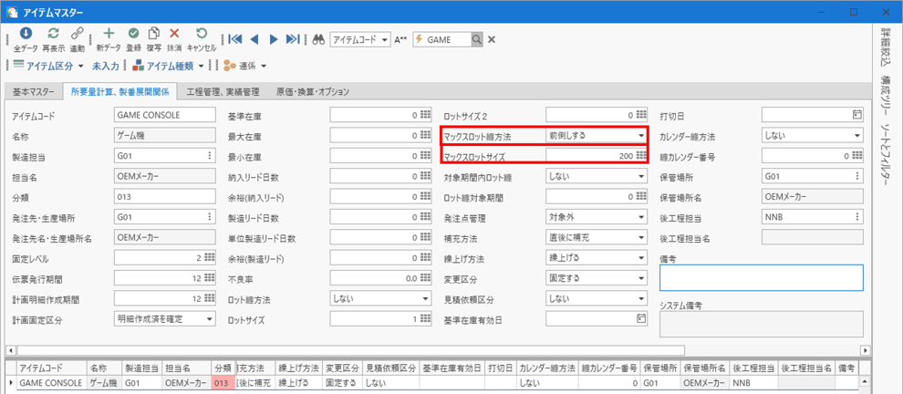[アイテムマスター]フォームを開き、マックスロット纏方法を「前倒しする」マックスロットサイズを「200」に設定します。