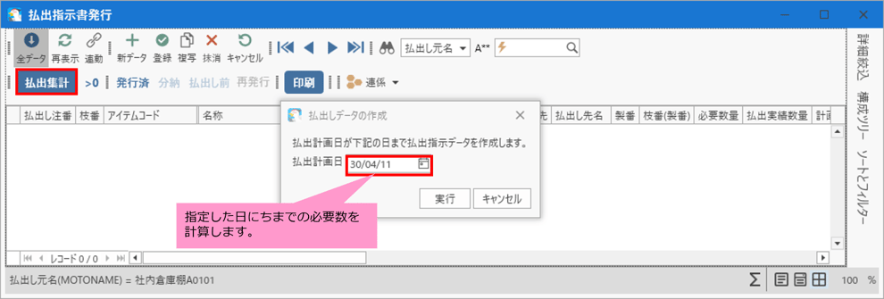 計画数量には、4月11日までに必要な数量が表示され、払出予定数には、在庫があり払出可能な数量が表示されます。