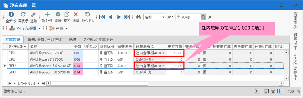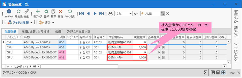 アイテムコード「CPU」「GPU」の払出実績入力を行ったことで、社内倉庫からOEMメーカーへ在庫が1,000個移動しました。