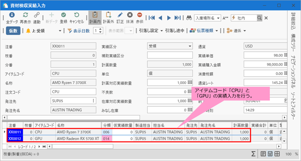 アイテムコード「CPU」や「GPU」の発注先が「AUSTIN TRADING」