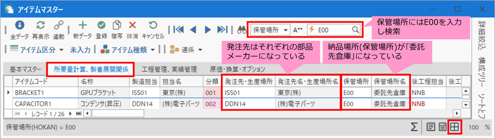 [アイテムマスター]フォームの[所要量計算、製番展開関係]タブを開き、[検索]バーの検索対象項目を「保管場所」に設定します。