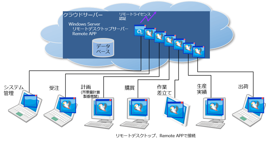 社内ネットワークにWindowsのリモートデスクトップサーバーを配置し、サーバー上にインストールされたTPiCSを、各クライアントPCからリモート操作で、所要量計算や製番展開、実績入力など、すべての処理をサーバー上で行う運用方法です。