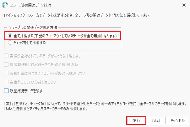 アイテムマスターの場合、下図の[全テーブルの関連データ抹消]パネルが開きます。