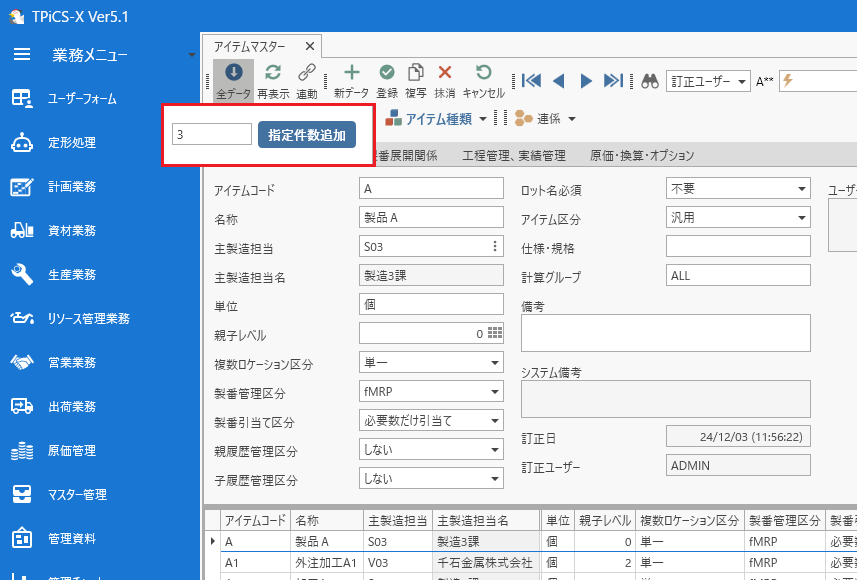ここでは、アイテムマスターを例にレコードの一括追加、複写、抹消の方法をご紹介します。
