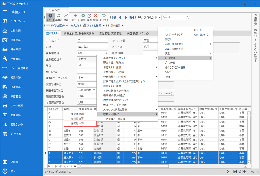グリッド上で抹消にしたいデータを選択し、[データ管理]-[複数データ操作]-[複数件抹消]をクリックします。